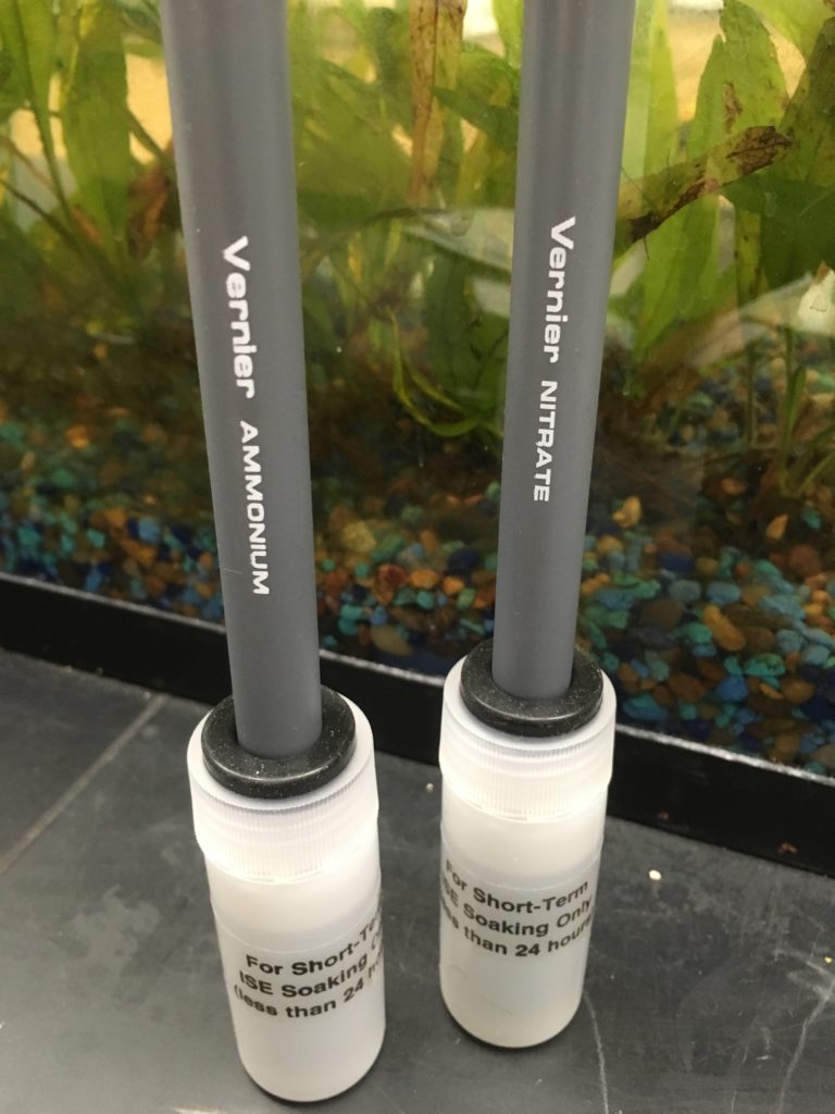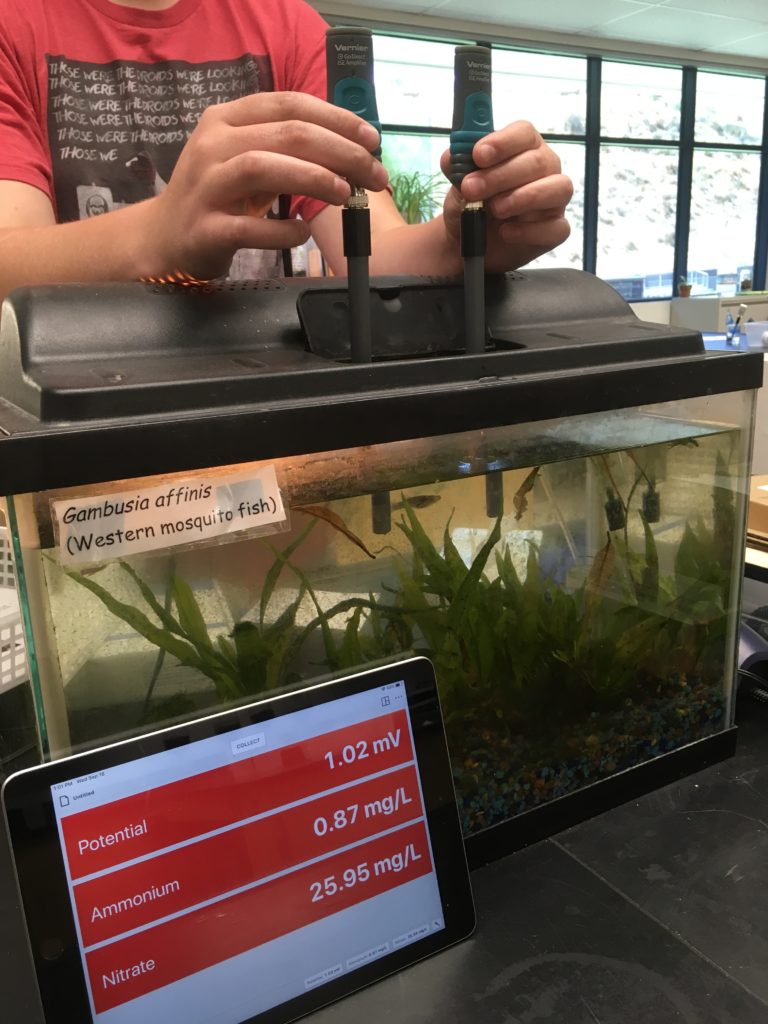 I tested Vernier’s wireless temperature, pH, optical dissolved oxygen, conductivity, nitrate and ammonia sensors. One group of students used the Vernier sensors for their ecocolumn data and I also tested the sensors in my fish tank.