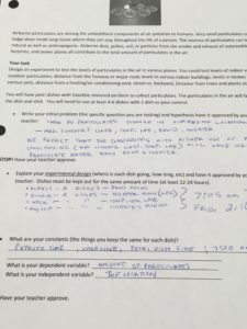 I give students some ideas such as comparing indoor vs. outdoor particulates, front yard vs. back yard or the number of pets. Some students come up with very creative ideas outside of these suggestions.
