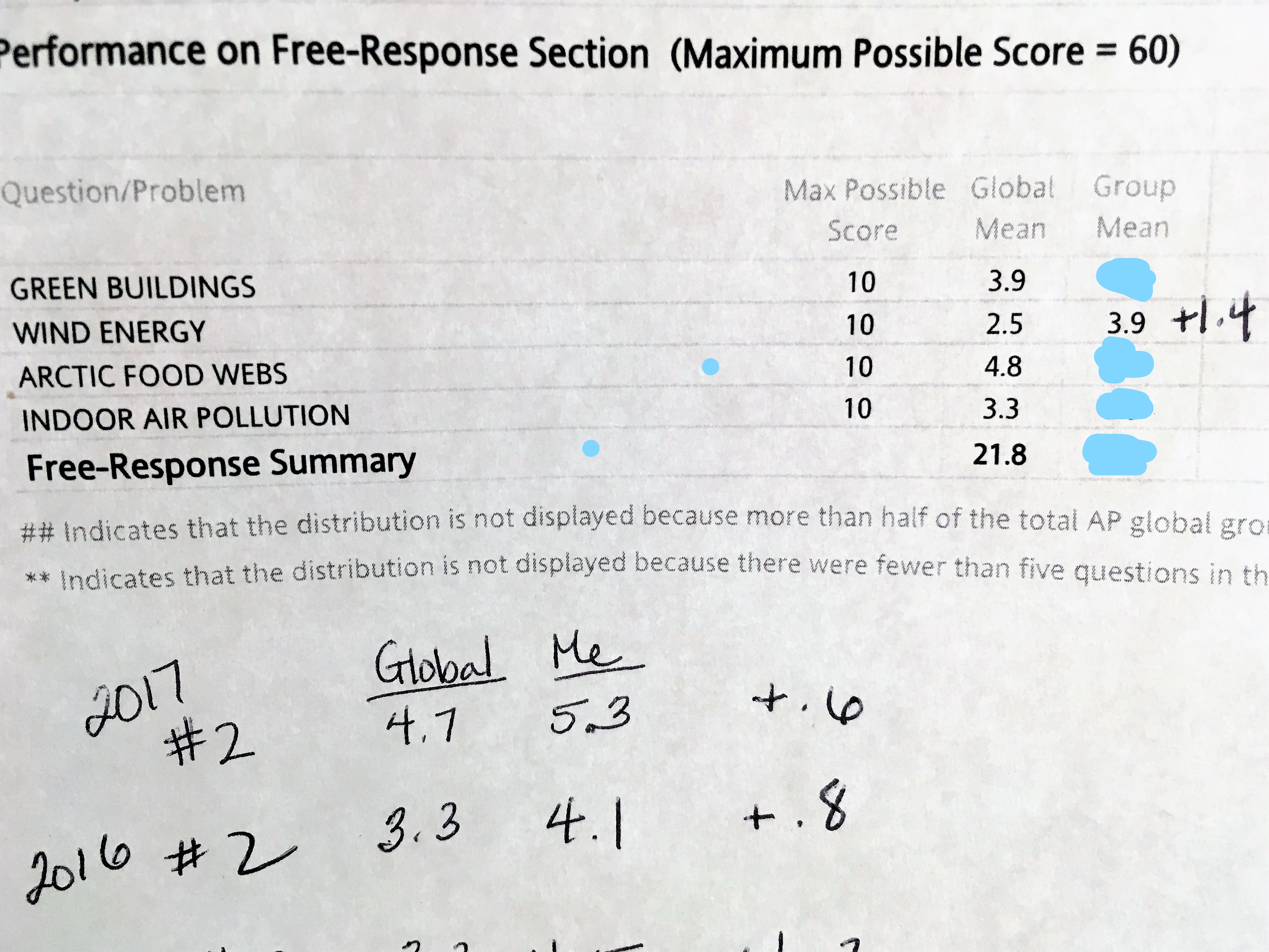 These are results from the 2018 exam. FRQ #2 was the Wind Energy FRQ. I have marked out all other scores for confidentiality