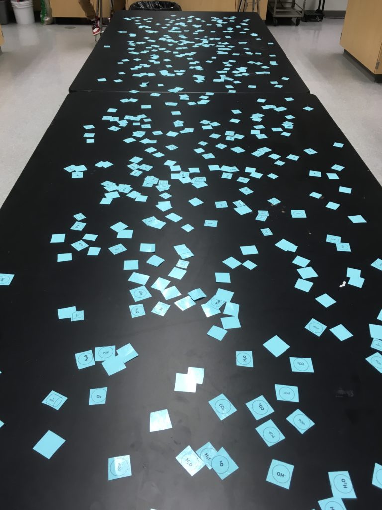 I use the center lab table in my lab, but you can do this outside or inside on the floor. I spread them out and don’t worry about turning them all over. I tell students they can only “hunt” with one hand and place the molecules in the other hand.