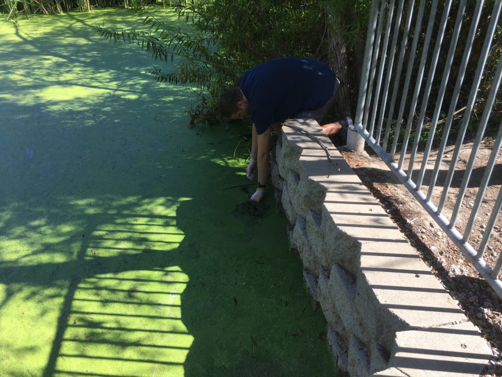 My son collecting duckweed.