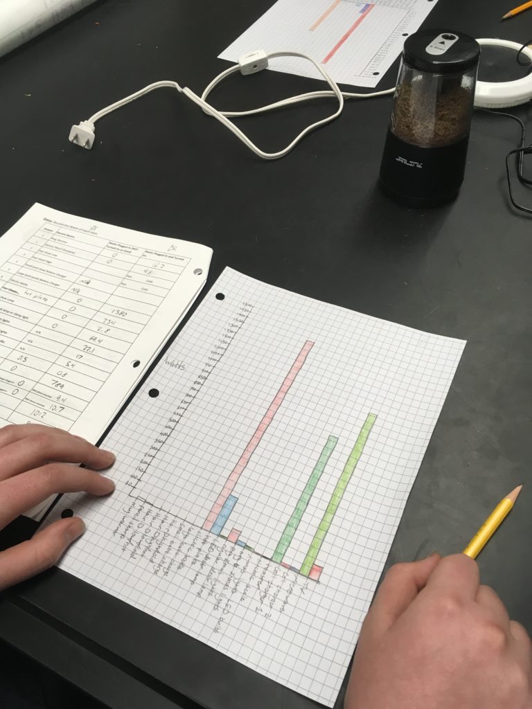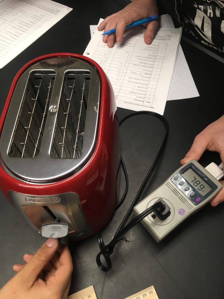 Students took data on a chart and then created a graph. I had a Kill-A-Watt meter set up at each lab table along with 2-3 appliances and then set a timer for kids to rotate every 4-5 minutes. I had 9 tables and it took about 45 minutes to rotate to every table.