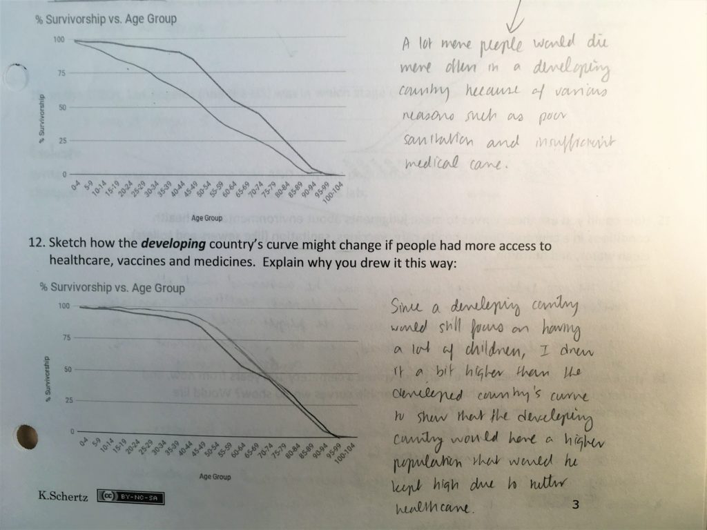 Students show deeper understanding by making predictions as to what would happen to a modern survivorship curve with various scenarios such as disease and pollution. By checking their predictive lines, you can see if they truly understand how survivorship changes. Students also connect survivorship curves with the demographic transition model.
