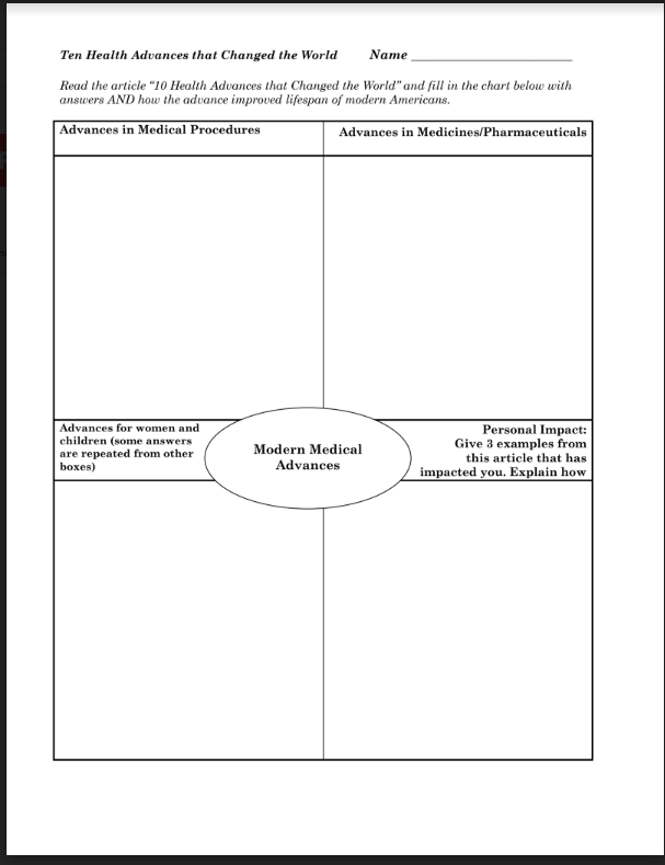 Now is the time to help students gain further understandings of population and introduce medical advances and diseases. I show this video on YouTube. Afterwards, students read this article “Ten Health Advances that Changed the World” and fill out this modified Frayer graphic organizer.