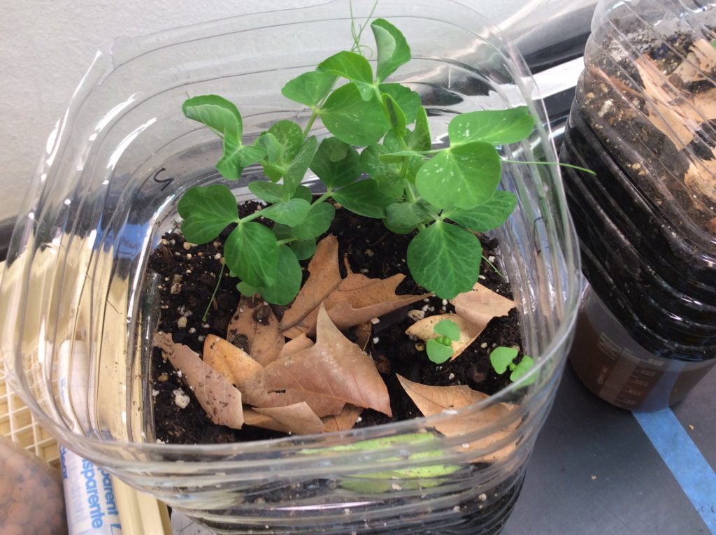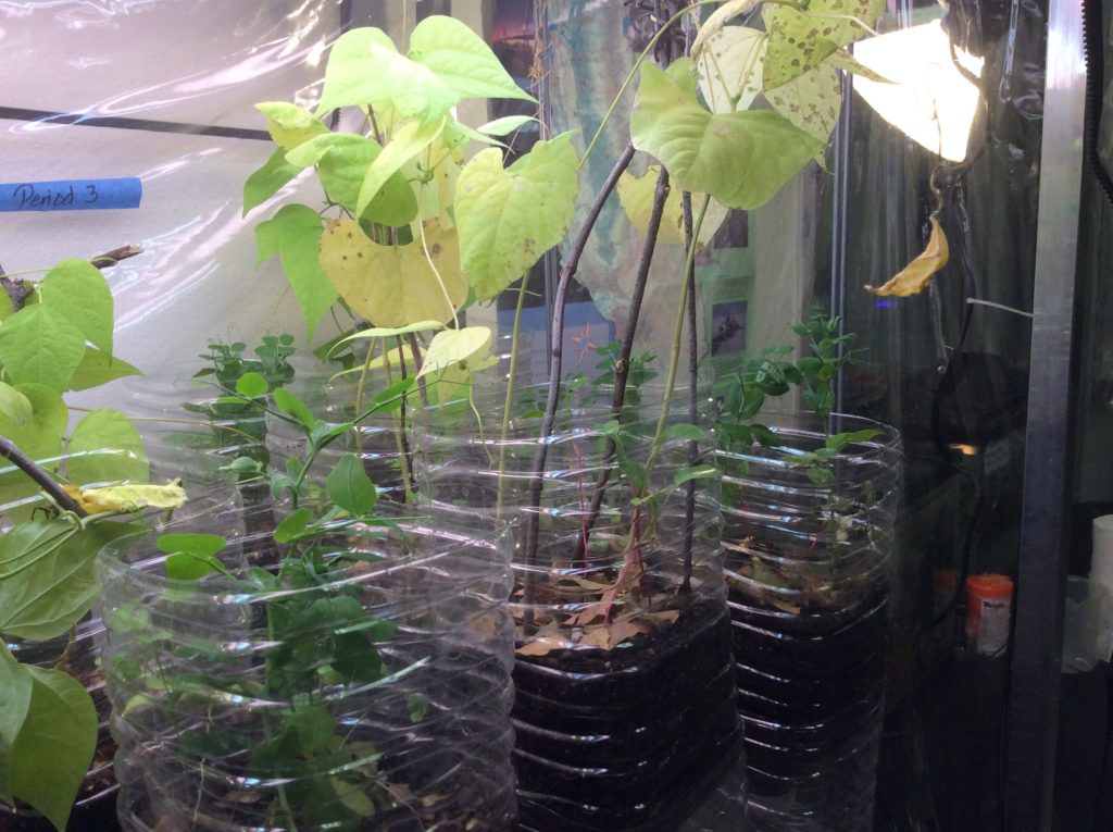 These plants are experiencing limiting factors. By their yellowing leaves, they may be running out of nitrogen or perhaps root space. They also have diseased leaves which is a density-independent limiting factor. - Decomposition and Detritivores and Leaf Litter. I favor a filter chamber instead of a decomposition chamber, but we add worms and other detritivores to the terrestrial chamber to teach them about decomposition. My students don’t live in a forest (we live in Chaparral) so they don’t know about leaf litter–this is how they learn.