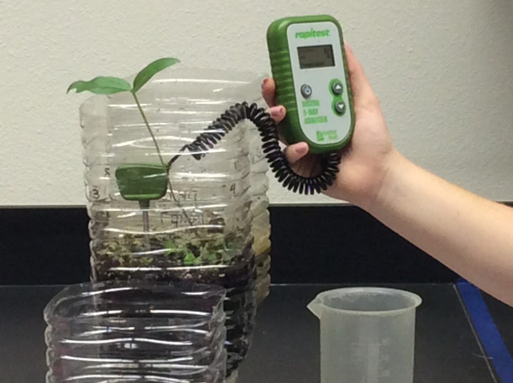 Dissolved oxygen probe and student taking data on their spreadsheet. - Soil Quality: Temperature, pH, fertility (NPK). Kids can see how soil quality changes (or doesn’t change) over time. You will need to guide them to why each test is important. They can also learn about soil structure, leaching, tannins, drainage etc.