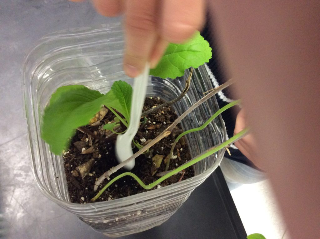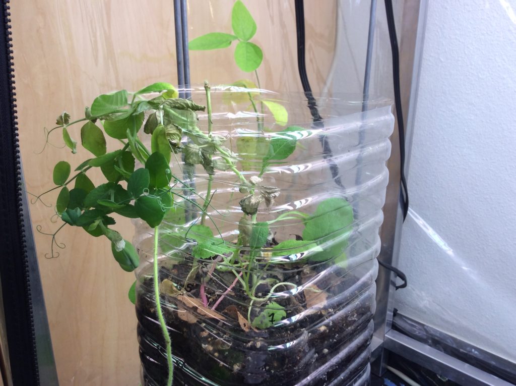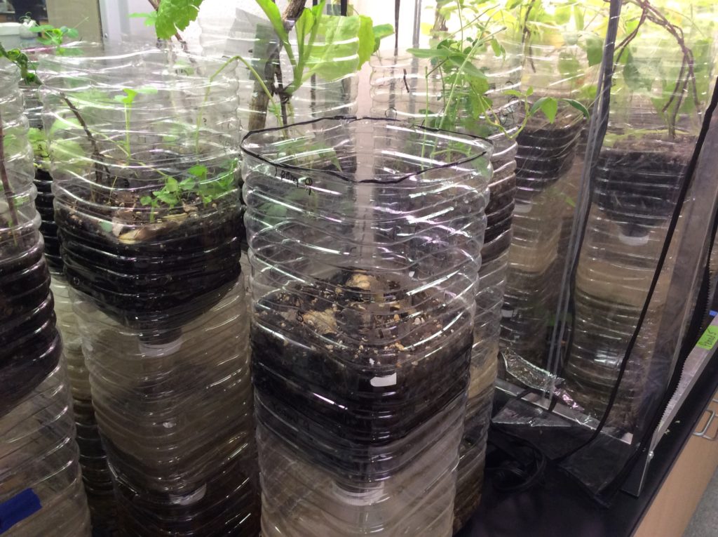 (To read about building ecocolumns, go to these posts: Student directions for building ecocolumns, Cutting and filling bottles, planting seeds and taking data , adding bugs, worms and leaf litter, and building the aquatic chamber.)