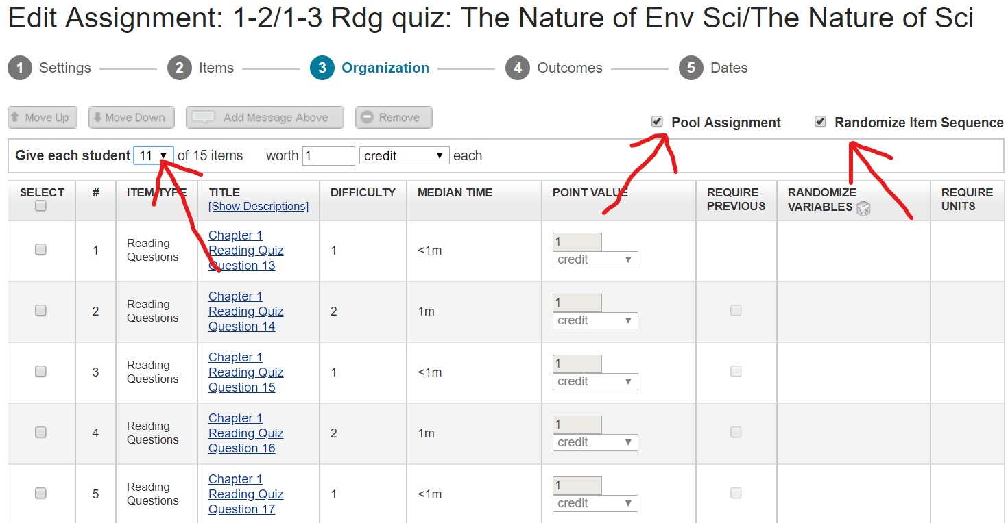 I combine all these questions into a “Coaching” assignment per chapter. The questions are often drag and drop vocab or steps in a process (like eutrophication), or animations with tutorials. My students do these in class so I am sure they are not copying.